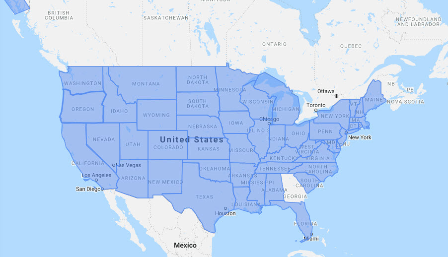 במקום לשלול את ארצות הברית בכללותה, העלנו רשימה של כל המדינות (למעט וויסקונסין ואילינוי, מאחר שהייתה חפיפה של שתי המדינות ברדיוס המיקוד שלנו).